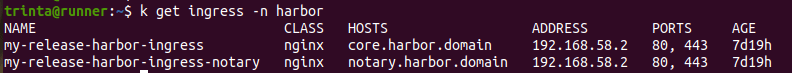 Executei o comando abaixo para verificar as FQDN e o IP do meu Ingress em questão, quer obter o core.harbor.domain: